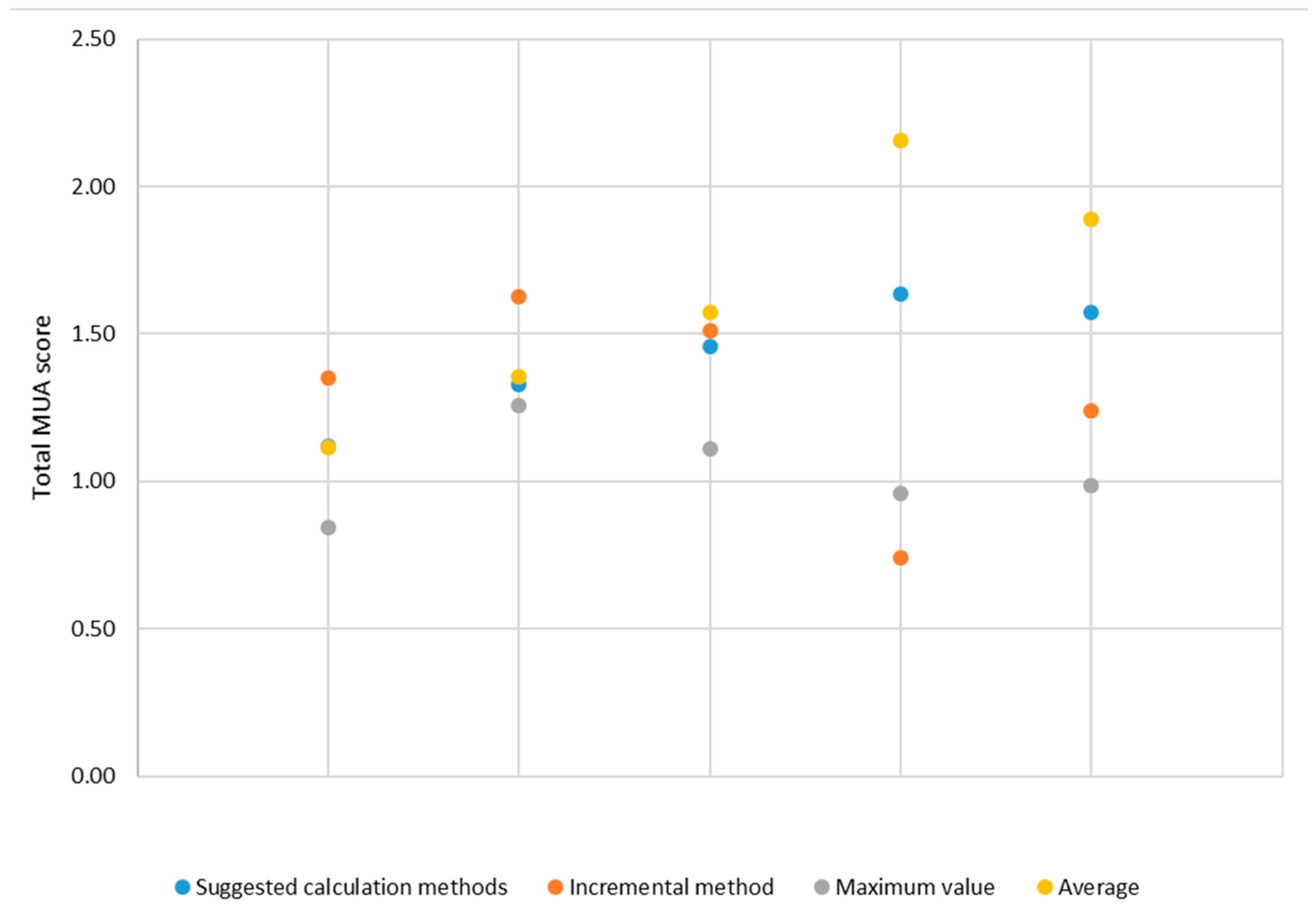 | Sub-Criterion | Calculation Method | MUA1 | MUA6 | MUA12 | MUA16 | MUA17 |