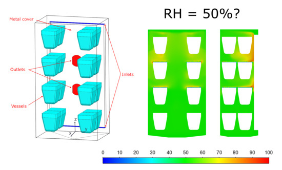 Figure 6, both the lower and upper shelves were characterized by large stagnant zones, resulting in poor evacuation of water vapor emitted from the surfaces of the wet sample–vessel assemblies. The CFD simulations allowed these effects to be quantified, revealing that local RH values above such assemblies can reach up to 90%, substantially exceeding the ISO tolerance of 5%.