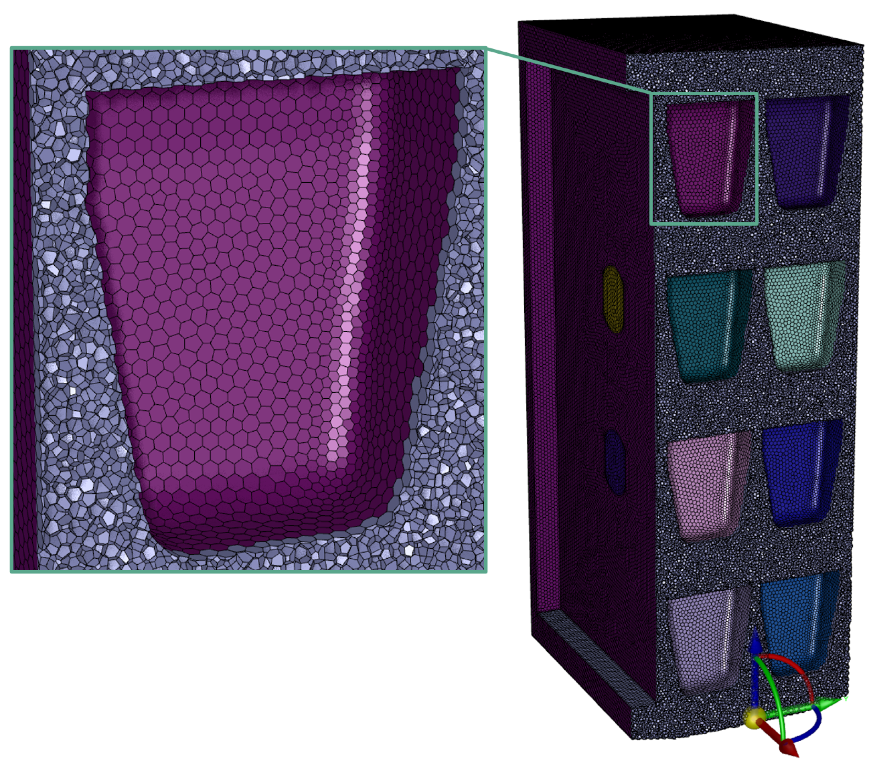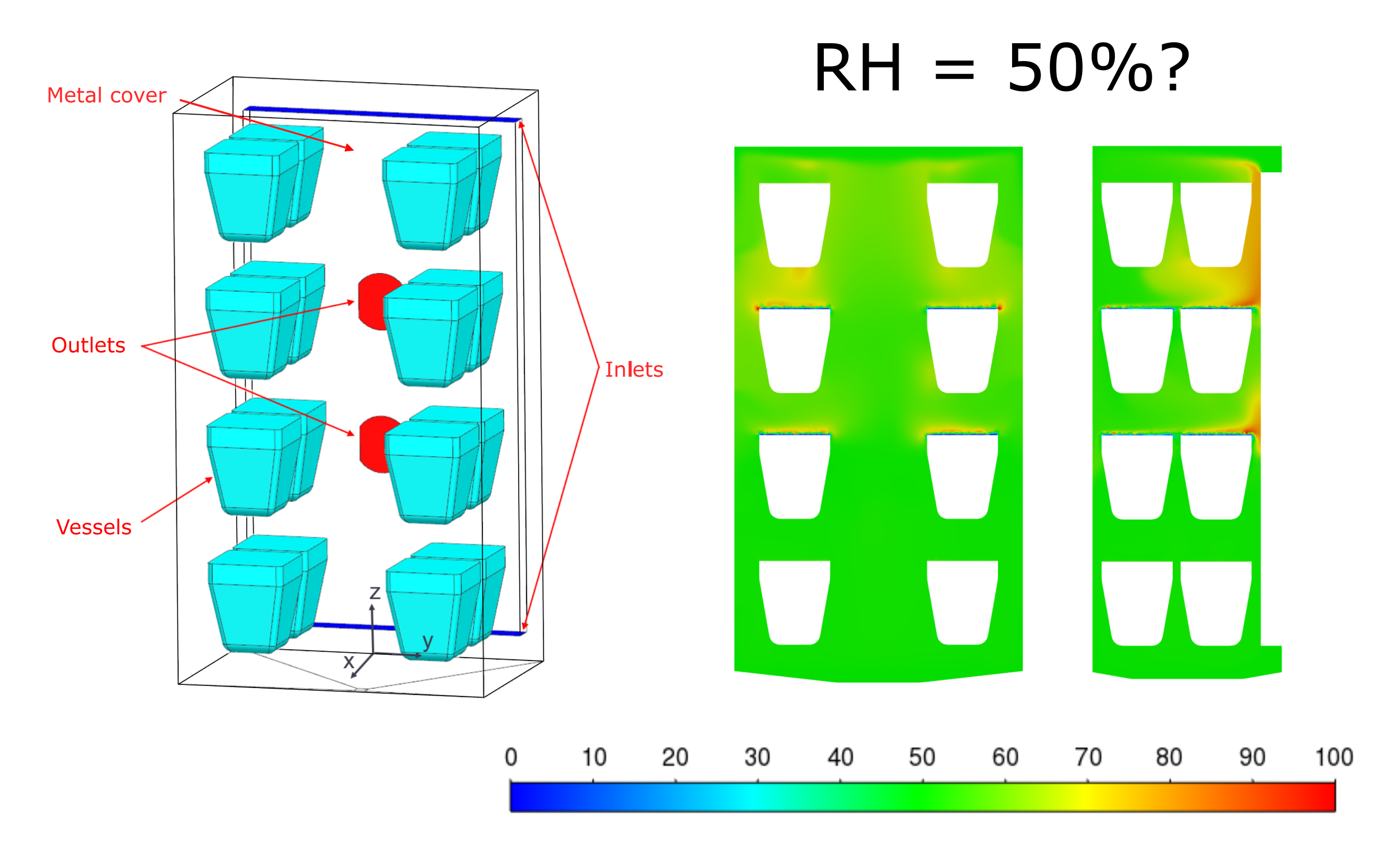 Control system assumptions. The simulation assumed a fixed behavior of the humidification system, i.e., the air inlets continuously supplied air at 50% RH. Combined with moisture emissions from the cups exceeding absorption, this resulted in an average RH higher than the 50% target. In reality, a control system would periodically switch off the humidifier or employ the Peltier cooler to condensate water in order to maintain a 50% reading at the sensor location. Although such control logic could be implemented in ANSYS Fluent in a dynamic simulation, we deliberately chose a simpler problem setup to ensure a robust and easily reproducible methodology. This simplification adequately illustrates when excessive humidity is properly evacuated from wet cups, while avoiding the complexities of simulating dynamic control effects.