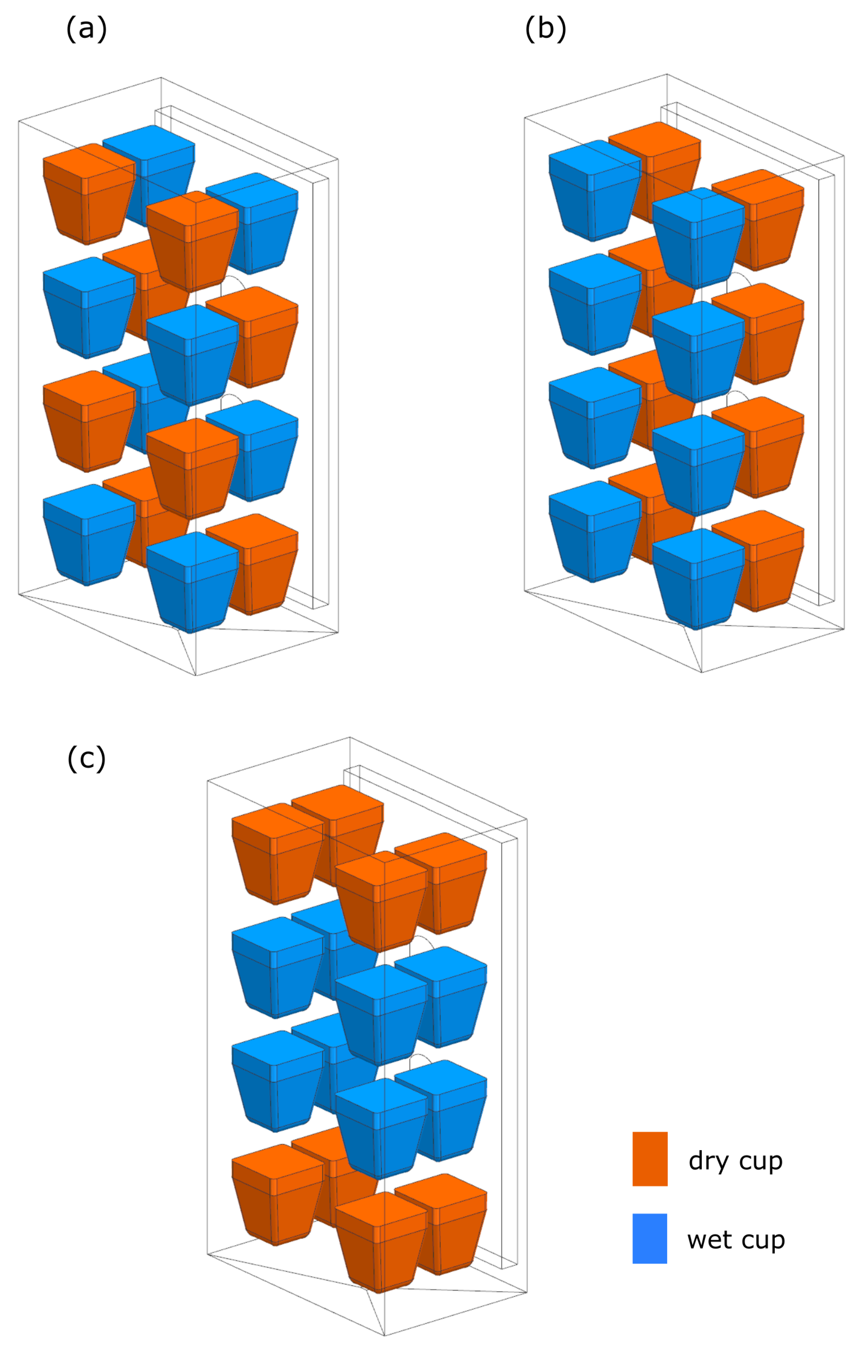 The investigation assumed that the chamber was loaded with 16 sample vessel assemblies, half configured as dry cups and the other half as wet cups, representing a typical testing scenario. Because the assemblies either emit or absorb moisture, their spatial arrangement can significantly influence local relative humidity (RH) despite forced air circulation. Two initial layouts were assumed to maximize internal uniformity by distributing an equal number of wet and dry samples on each shelf (