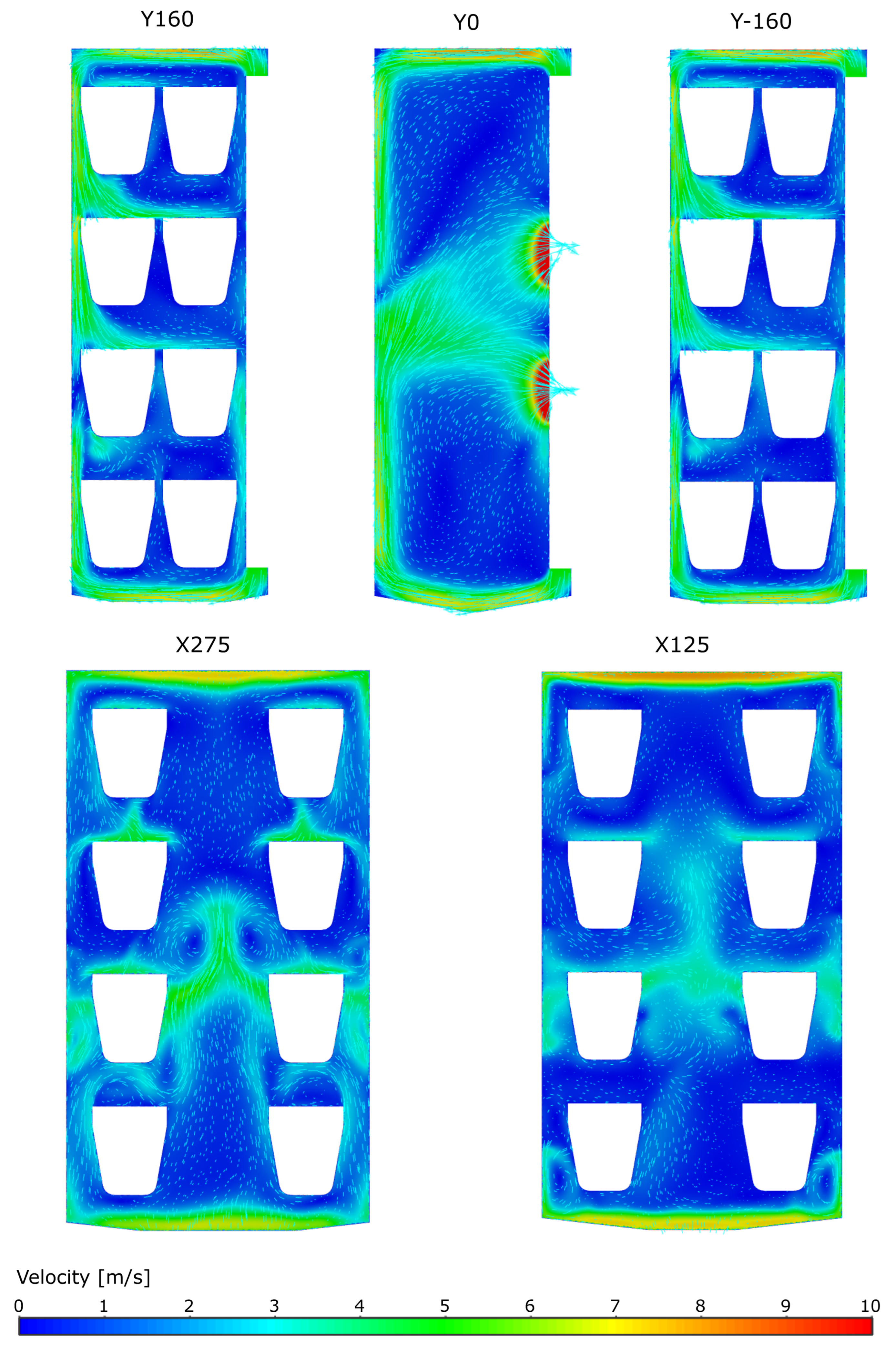 Figure 6 shows the corresponding field distributions. The planes X125, X275, Y160, and Y–160 were selected so that they intersect at representative central points above the sample–cup assemblies, enabling a clear comparison of local flow and RH conditions. The plane Y0 passes vertically through the center of the chamber. The results in