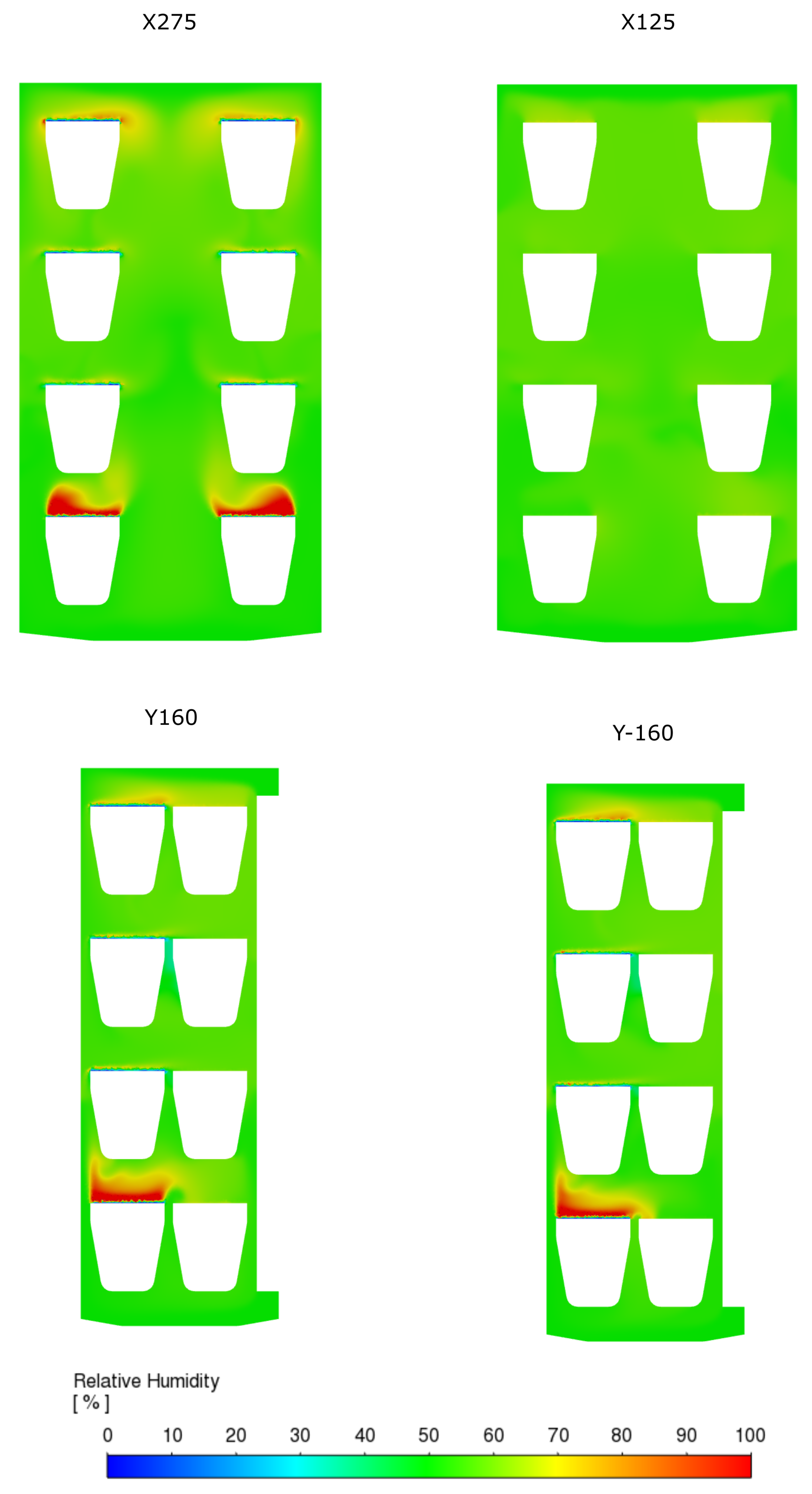 Figure 5b (excluding plane Y0, which does not intersect any assembly and hence is nonessential for the RH analysis). The results show that placing wet cups on either the top or bottom shelf produces localized regions of elevated RH above the samples (