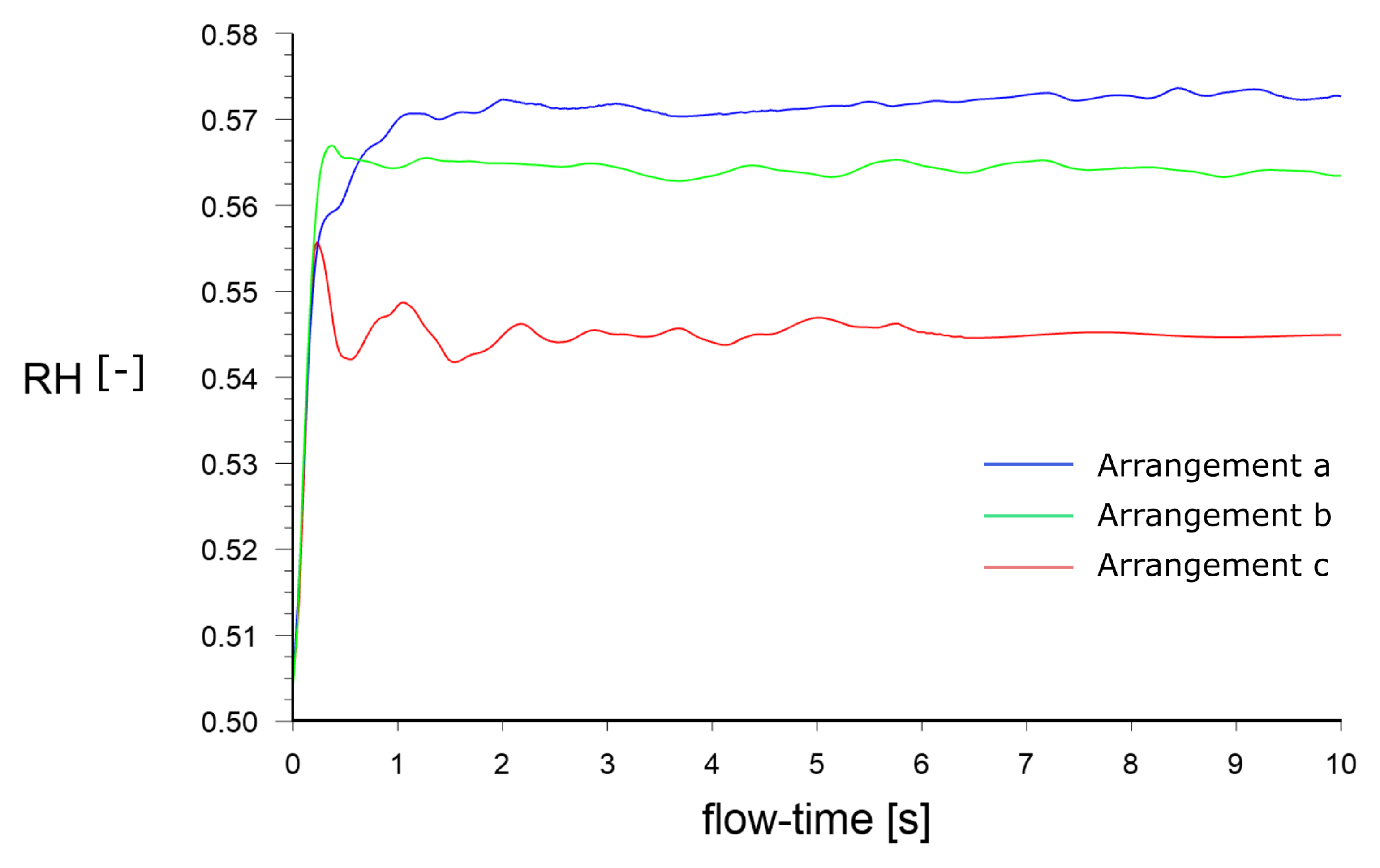 Figure 10, showing the evolution of average RH in the domain, serves as a concise summary of these findings. The average RH for arrangement