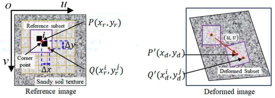 The schematic diagram of the correlation matching is illustrated by Figure 6. Given any point P located at on the reference image, its corresponding on the deformed image can be located by first specifying a square reference subset centered at the , and then searching the deformed subset on deformed images by optimizing the robust zero-mean normalized sum of squared difference (ZNSSD) criteria defined as []: