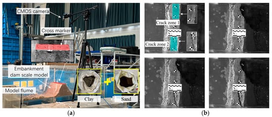 The testing system consists of a flume, an earth-fill dam scale, and an image acquisition device, as shown in Figure 7. The length, width, and height of the flume were 200 cm, 50 cm, and 80 cm, respectively. Three sides of the flume are made of plexiglass to facilitate observation of the water level and dam failure. The model dam was built using layered filling technology with clay and sand as materials. Its length, width and height are 50 cm, 70 cm and 20 cm, respectively. In addition, several markers were placed at equal intervals on the dam crest to measure the horizontal displacement of the dam under hydrostatic pressure. The image acquisition device primarily includes a CMOS camera and a laptop. The camera resolution is set to 2448 × 2048 pixels, and it is equipped with a 25 mm fixed focal length lens. Due to the lack of unique texture features on the surface of earth-fill dams, this study uses the cross markers arranged on the dam crest as measuring points.