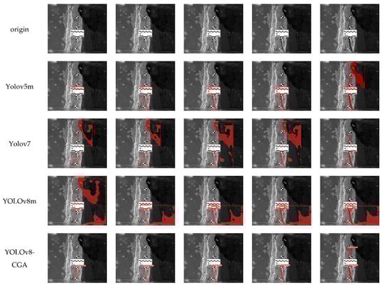 In the second through fourth column images: YOLOv5m, YOLOv7, and YOLOv8m all showed varying levels of false detections, indicating fundamental limitations in distinguishing cracks from complex dam surface textures. In contrast, the YOLOv8-CGA model precisely identified the existing vertical cracks, exhibiting higher detection precision.