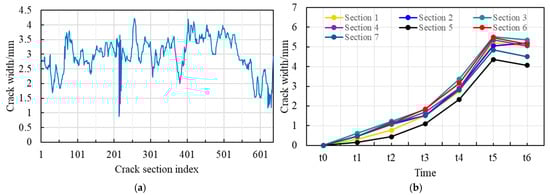 Crack evolution trends are crucial for assessing the health status of the structure. The crack widths at six time points for the crack section shown in Figure 9a were statistically analyzed, as presented in Figure 10b. It is evident that each section of the crack underwent stages of initiation, propagation, and stabilization, which aligns completely with the experimental results.