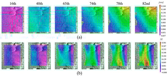 Figure 12 shows the displacement and maximum principal strain fields in the crack region at different testing stages. A pronounced discontinuity can be clearly observed in the displacement field of Figure 12a, becoming increasingly evident as the water level rises. The corresponding strain field, illustrated in Figure 12b, exhibits localized strain concentration zones near the crack initiation sites, particularly in the 74th and 82nd images. Notably, at these stages, no visible cracks were detected in the raw images, indicating that DIC-derived strain fields can reveal deformation precursors well before crack manifestation.