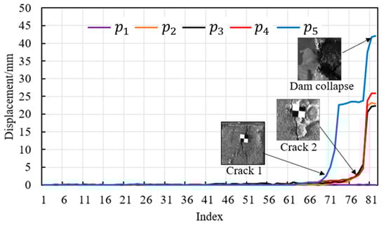 To explicitly illustrate the displacement due to dam deformation, we analyzed only the 80 images captured before the collapse. The displacements are shown in Figure 14. It is observed that the displacement curves of points p1 and p5 differ significantly from the other three points. Notably, p1 exhibits no obvious displacement throughout the process, whereas p5 shows the largest displacement and is the first measurement point to be significantly displaced. This is attributed to the appearance of two major cracks during the experiment. The first crack appeared in the area of p5, resulting in significant displacement. As the water level rose, this area became a failure initiation zone, leading to failure. The second crack initially appeared near p2 and gradually extended towards p3 and p4, resulting in similar displacement trends for these three points of interest. In summary, the displacement curve shown in Figure 12 is consistent with the actual scenario, verifying the feasibility of DIC technology for dam displacement measurement.