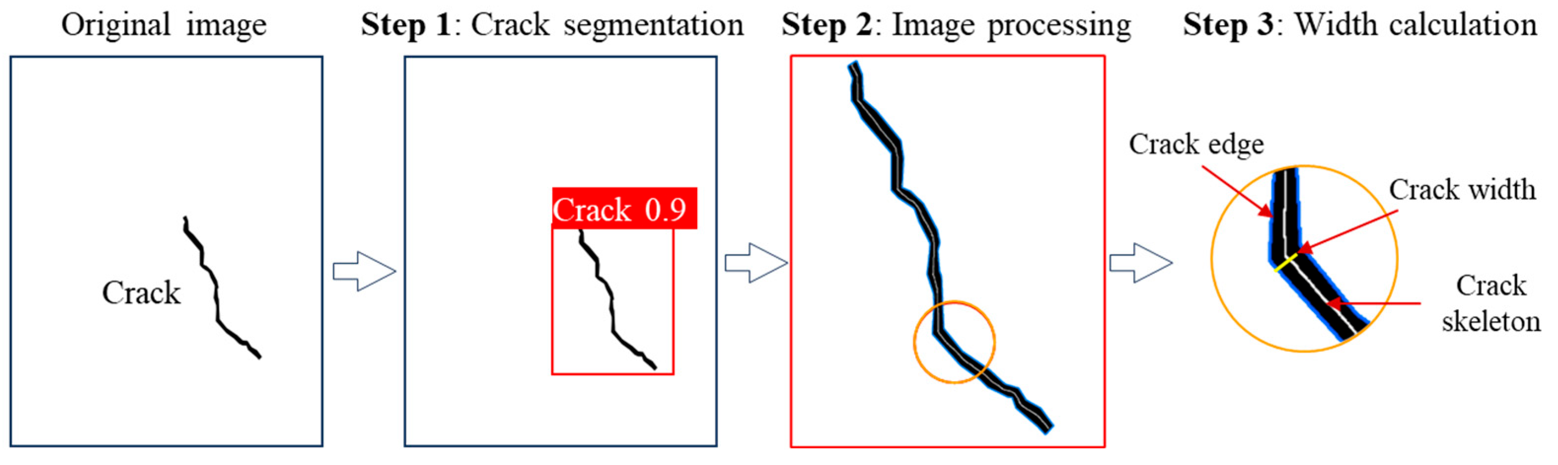 - Li, Z.; Miao, Y.; Torbaghan, M.E.; Zhang, H.; Zhang, J. Semi-automatic crack width measurement using an OrthoBoundary algorithm. Autom. Constr. 2024, 158, 105251. [Google Scholar] [CrossRef]