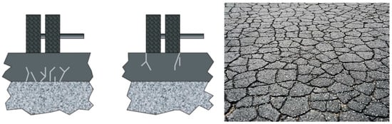 On the other hand, fatigue cracking is a consequence of repeated traffic-induced loading (Figure 3). Although mechanical in origin, it is more prevalent at low temperatures, where increased mixture stiffness and brittleness reduce flexibility, so fracture under cyclic loading tends to be a consequence of reduced ductility rather than plastic deformation []. Moisture exposure further accelerates fatigue crack initiation by lowering stiffness and interfacial strength. In RCA-based mixtures, this effect is intensified by the porous mortar phase, which retains internal moisture and promotes microcrack coalescence under cyclic stress [,,]. Consequently, pavements containing high RCA proportions exhibit reduced fatigue life, particularly under high groundwater levels or poor drainage conditions where saturation cycles are frequent [,]. Initially, fatigue cracks appear as fine, discontinuous surface fissures. With continued traffic, these fissures propagate and interconnect, forming larger cracking patterns. In advanced stages, alligator cracking develops, compromising structural capacity and surface functionality by reducing the integrity of the wearing course, altering profile smoothness, and facilitating the ingress of water and air; over time, these conditions accelerate internal damage, promote pothole formation, and may culminate in structural failure [].