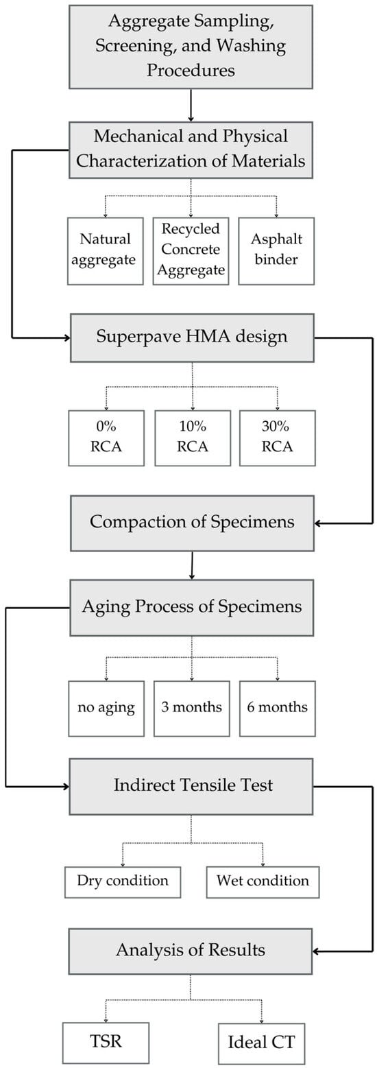In this study, three dense-graded asphalt mixtures were fabricated using a common aggregate gradation. The single experimental variable was the mass-based replacement of virgin aggregate with recycled concrete aggregates (RCAs) at 0% (control), 10%, and 30%. For the two RCA mixtures, replacement was applied proportionally across all sieve fractions to preserve the target gradation. From the test data, two key indicators were obtained: The Tensile Strength Ratio (TSR), which quantifies the relative strength loss between wet and dry conditions, and the Cracking Tolerance Index (CT-index), derived from the load–displacement response. The overall experimental procedure is summarized in Figure 4.