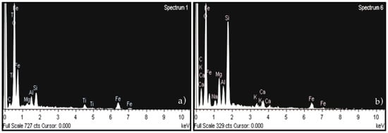 The resulting EDS spectrograms for both aggregate types are presented in Figure 5a, b. An interpretation of the mineralogical composition based on these spectra is summarized in Table 3.