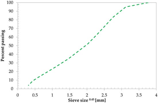 This study adopted the volumetric design from a local paving project, originally formulated to use the mineral aggregates and the asphalt binder described in Section 2.1. The aggregate gradation (Figure 6) corresponds to a dense-graded mixture with a 19.0 mm (¾ in) nominal maximum aggregate size. The optimum asphalt content (OAC) was recalculated for mixtures incorporating 10% and 30% recycled concrete aggregate (RCA) by mass, using the natural aggregate as the base. The OAC was determined by compacting 150-millimeter-diameter × 115-millimeter-high specimens with the Superpave gyratory compactor in accordance with AASHTO T 312 [], targeting 4.0% air voids at traffic level < ESAL’s < (medium-to-high traffic) design compaction. The mixture produced with 100% natural aggregate is referred to as the control mix, and the RCA variants are denoted 10% RCA and 30% RCA. Volumetric properties of asphalt mixtures are presented in Table 5.