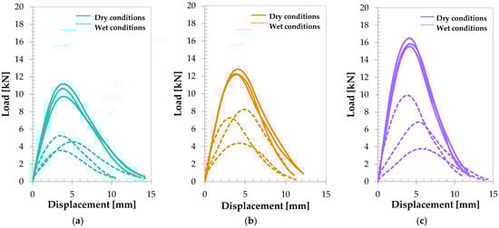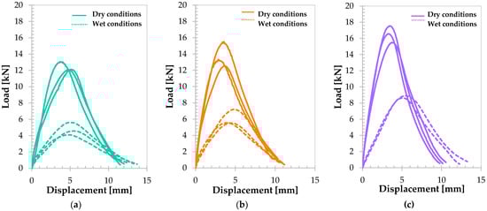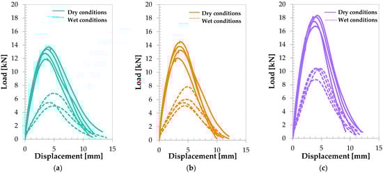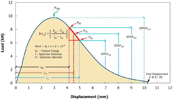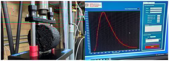 All specimens, wet and dry, were equilibrated to 25 °C for 1 to 2 h before ITS testing. A diametral compressive load was then applied at 50 mm/min using a model 661.21B-02 universal loading frame (MTS Systems Corporation; Minneapolis, MN, USA). Proprietary software developed by the Instituto de Ingeniería, UNAM, was used to control the test and record the load–displacement data for each specimen (Figure 10). The post-immersion conditioning specified in AASHTO T 283 was applied after the long-term water-immersion stage to ensure methodological consistency between aging levels.