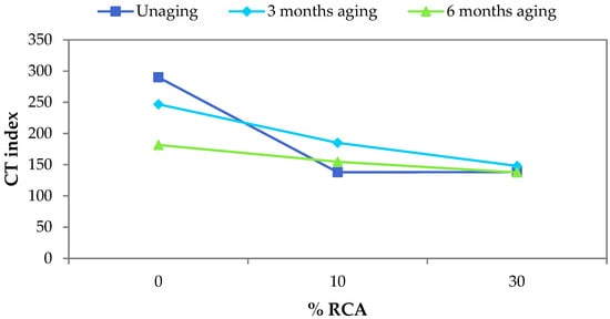 Under extended water exposure, mixtures incorporating higher contents of RCA exhibit progressive reductions in Indirect Tensile Strength (ITS), Tensile Strength Ratio (TSR), and fracture energy, reflecting increased brittleness and reduced mastic cohesion. This tendency, observed in several long-term water-immersion aging studies, confirms the cumulative effect of hydric exposure on RCA-modified mixtures [,,]. The gradual loss of strength parallels the decrease in fracture energy reported for dense-graded mixtures with high RCA content, indicating that the brittle nature of the residual mortar governs post-fracture behavior [,].