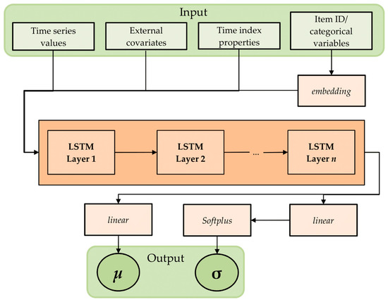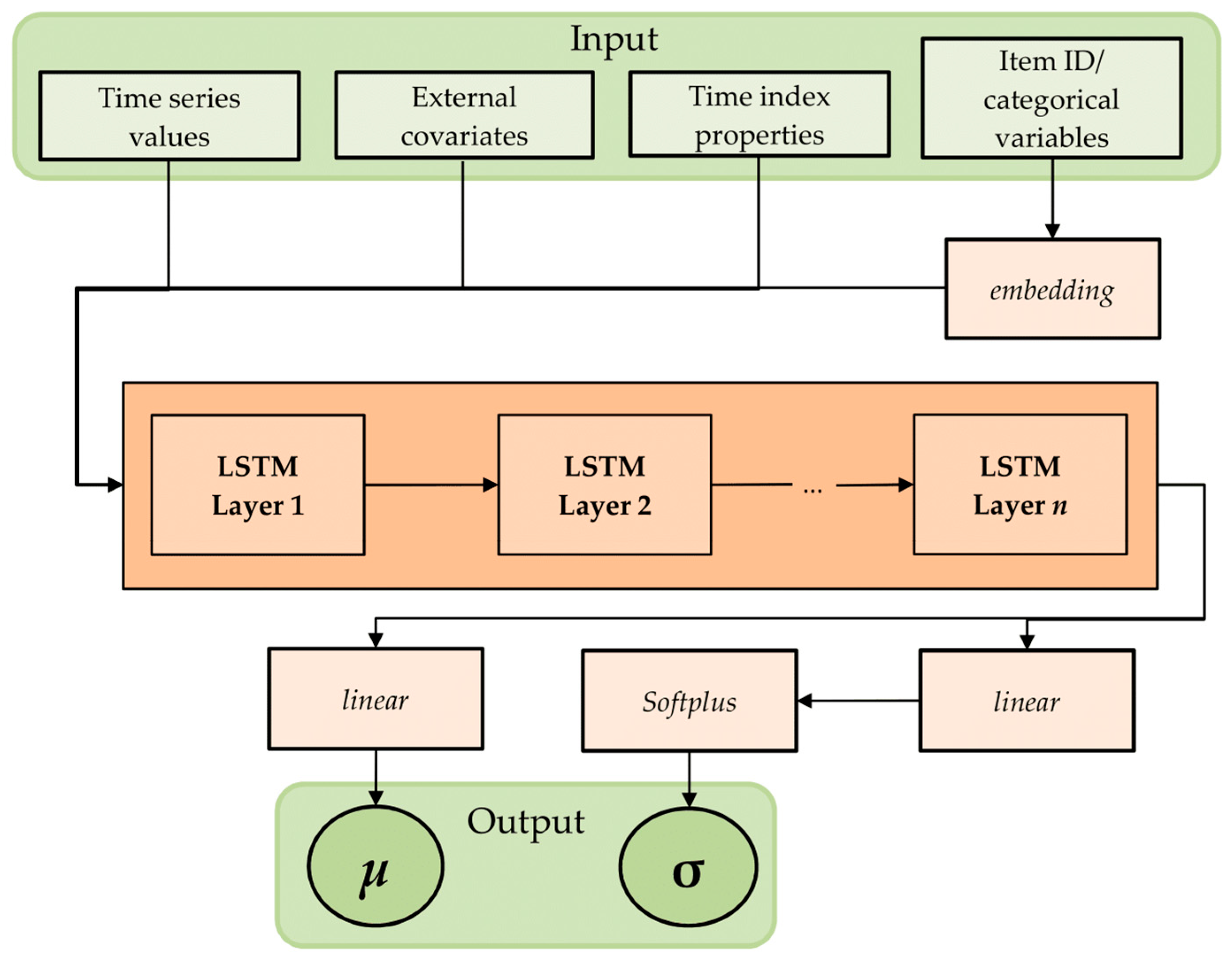 The model operates in an autoregressive manner, meaning that each predicted value depends on previous observations. At each time step, the model receives as input the previous value of the series along with optional covariates. The architecture based on multiple LSTM networks allows the model to capture long-term temporal dependencies. The hidden state is updated according to the following recurrence: