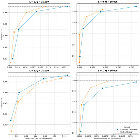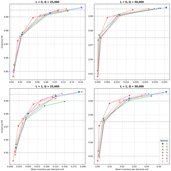 Extending the forecast horizon (L = 1) led to more heterogeneous results, which remained sensitive to the Q parameter. For Q = 25,000, both the mean inventory level and the empirical fill rate increased. Further increases in Q yielded similar fill rate outcomes, suggesting diminishing marginal returns.