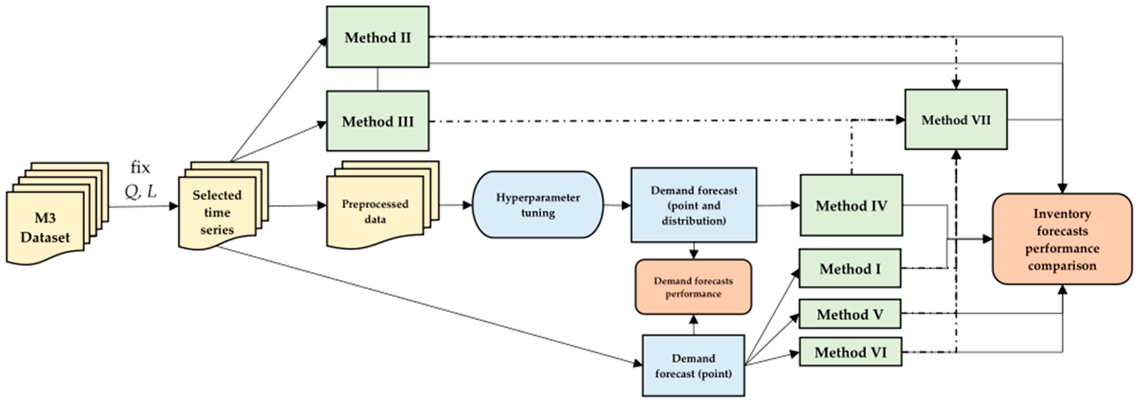 Demand forecasting in supply chains is a starting point and a basis for supply chain planning and operations management in the short, medium, and long run [5] and should be considered a key component of the logistic support system of an enterprise [6,7]. In fact, this is the demand uncertainty which makes supply chain management so challenging in practice and which directly translates into supply chain costs and benefits. For this reason, forecast precision in so-called supply chain forecasting is the key determinant of future cash flows of supply chain partners [7]. It also has a direct impact on sustainability by reducing overproduction and waste, improving resource utilization, lowering inventory levels, and enhancing the efficiency of logistics operations [8]. The recent surge of the use of business analytics and expansive datasets from information systems such as ERP and CRM has further elevated the importance of forecasting in the business context [9,10]. Recent developments in machine learning and deep learning have introduced novel approaches to inventory forecasting. Models such as DeepAR [11], which utilize autoregressive recurrent neural networks, have shown promising results in capturing complex temporal dependencies and probabilistic patterns in demand data [12]. These methods complement traditional econometric approaches and offer enhanced flexibility, especially in environments with large datasets and nonlinear dynamics [13].
