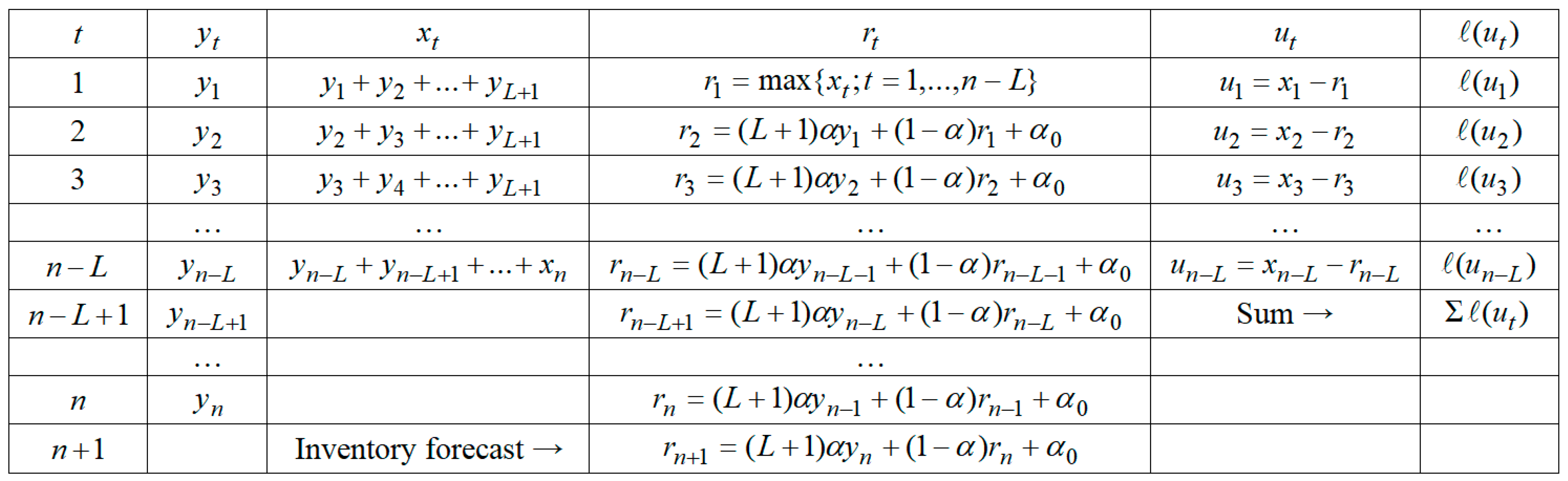 In this paper, we take a similar viewpoint and develop an inventory forecasting algorithm which uses M-estimation to directly model the inventory level used in an inventory system. This algorithm adapts the popular exponential smoothing model to inventory forecasting in the periodic review re-order point inventory system with fixed order quantities, non-negative lead times, and a P2 service level target, building on the previous work of one of the authors, where the inventory context was different [18,26]. In an empirical exercise, the model is confronted with state-of-the-art alternatives such as, among others, the Generalized Autoregressive Score (GAS) model and the algorithm assuming separate smoothing of mean and variance, providing very promising outcomes. Finally, the presented approaches are compared with the deep learning probabilistic model DeepAR [11], which enables one to create distributional forecasts of multiple time series. Hence, this study addresses a notable gap in the literature: while DeepAR has been widely applied in general time series forecasting, its use in modeling reorder points under fill rate constraints remains unexplored. Ref. [27] propose a data-driven framework that leverages large datasets to improve demand estimation and inventory optimization in the context of the newsvendor problem using fully connected feed-forward Artificial Neural Networks with a single hidden layer, Gradient Boosted Decision Trees, and quantile regression techniques. Their empirical evaluation, conducted on point-of-sales data from a German bakery chain, reveals that data-driven methods generally outperform traditional model-based approaches, especially when sufficient data is available. Furthermore ref. [28] use LASSO (Least Absolute Shrinkage and Selection Operator) and group LASSO in the data-driven newsvendor models to optimize the demand estimation and replenishment decisions by extracting key features from high-dimensional and mixed-frequency data.