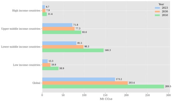 Estimated global GHG emissions from solid waste management across income groups for the years 2023, 2030, and 2050. Elaborated from: [7].