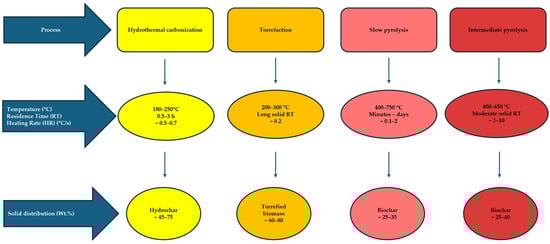 There are several main processes (see Figure 2) for producing char, that differ in feedstock flexibility and operational parameters as well as in the resulting quality and yield of the products. Among the prevalent techniques, slow and intermediate pyrolysis stand out, with slow pyrolysis proving to be the most efficient approach for generating substantial quality of biochar considering the carbon retention and longest residence time [19]. It is worth mentioning two additional pre-treatment methods for transforming carbon from biomass: torrefaction and hydrothermal carbonization (HTC), whose solid products have different structures in comparison to biochar.