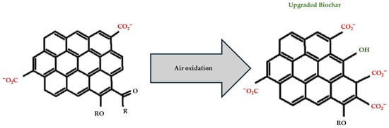 After the biochar is heated to the desired temperature (800–900 °C) for 1–2 h, it is exposed to hydrogen, air, or argon gases, and new functional groups are formed on its surface [75]. As illustrated in Figure 4, heating biochar in an air environment significantly changes its surface chemistry, which in turn influences its ability to absorb organic and inorganic compounds. Overall, thermal treatment enhances the adsorption of both polar and nonpolar substances. Thermal treatment can significantly increase the porosity and surface acidic groups of biochar and creates new adsorption sites on biochar for organic/inorganic molecules. The optimum thermal air oxidation temperature is in the range of 400–500 °C. Considering the potential variability related to the feedstock, biochar made from lignin-rich feedstocks is preferable for thermal air oxidation treatment [76,77,78].
