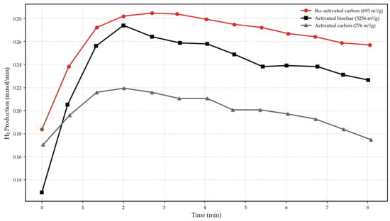 The biochar produced by slow pyrolysis (pyrochar) with a low heating rate and high residence time is generally more structurally stable, has a higher carbon content and greater porosity suitable for high temperature conversion processes as a medium, and can even help with the cleanup of pollutants. To put it more simply, pyrochar is more stable in the long term as a conditioner and amendment for soil and environmental use [37]. The production of biochar involves the breakdown of organic materials and the removal of volatile compounds, resulting in a stable matrix with enhanced aromatic carbon structures. These structural features are crucial for biochar’s catalytic functions, as they contribute to its large surface area, increased porosity and abundant active sites, all of which facilitate chemical interactions and make biochar an effective catalyst [38].