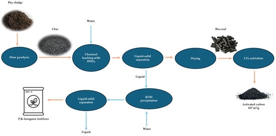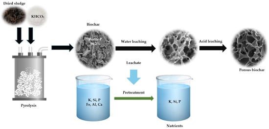 - Qiu, J.; Hou, H.; Liang, S.; Yang, L.; Gan, Q.; Tao, S.; Yu, W.; Lv, R.; Ding, L.; Xiao, K.; et al. Hierarchically porous biochar preparation and simultaneous nutrient recovery from sewage sludge via three steps of alkali-activated pyrolysis, water leaching and acid leaching. Resour. Conserv. Recycl. 2022, 176, 105953. [Google Scholar] [CrossRef]