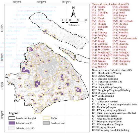For the purpose of systematic and concise analysis, several industrial parks with strong spatial agglomeration and industrial linkages were consolidated into industrial clusters (ICs). The criteria for generating ICs encompass the geographical characteristics of the industrial plot’s location, shared transport resources, industrial sector classification, and upstream and downstream industrial chain connections. Furthermore, buffer zones were delineated around each park boundary to capture the spatial extent of their developmental influence. The determination principle is based on the park’s area and the LULC of surrounding areas. Generally, large IPs/ICs located in a sparsely populated area may have more far-reaching impacts, while an industrial park situated in a densely built-up area is constrained by existing development. Ultimately, 104 industrial parks (including both core areas and buffer zones) were aggregated into 43 industrial parks (IPs) and 21 industrial clusters (ICs). The spatial distribution and customized coding of these parks are shown in Figure 1, with detailed information provided in Table A1.