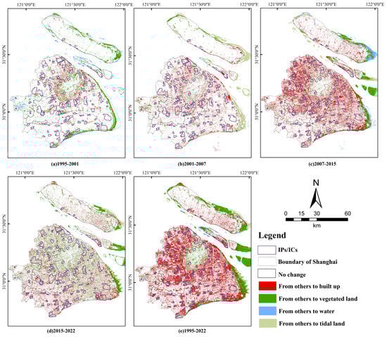 The classification procedure is as follows. First, based on preprocessed remote sensing images, standard false-color composite images were generated using bands suitable for interpretation to fully represent surface features. Second, 100–120 random points per LULC category were selected through visual interpretation to construct representative training samples. Third, MLC was applied to generate LULC maps for five selected years, with an overall classification accuracy ranging between 79.71 and 81.92%. The error matrices, overall accuracy, user’s accuracy, and producer’s accuracy for the five-year LULC maps are provided in Table A2 and Table A3. It should be emphasized that, although the Kappa index is commonly used to evaluate classification accuracy, Pontius and Millones argued that this metric has significant limitations []. Therefore, this study did not employ the Kappa index. Moreover, we tried many times but were unable to achieve satisfactory accuracy with the MLC algorithm alone. Thus, the post-classification products were converted into editable polygons and then manually refined using auxiliary datasets. These datasets have two primary data sources, as outlined in Table 1: (1) high-resolution satellite imagery, including Sentinel-2 with a spatial resolution of 10 m and GF-1 WFV with a spatial resolution of 16 m, and (2) the commercial urban thematic layer of Shanghai (Table 1). In particular, we corrected numerous polygons that had been misclassified as tidal land by validating them against the reference datasets. Subsequently, the second accuracy assessment of these manually corrected products utilized a stratified random sampling method to ensure the spatial representativeness of the validation dataset. Sample points were strategically distributed to encompass all concentric urban zones within the study area, ranging from the urban core to suburban and exurban areas, as well as the surrounding regions of major IP/ICs. Specifically, 120–150 validation sample points were designated for each LULC category. This approach resulted in a total sample size of 520 to 600 points for each year. To ensure reliable validation, each sample point’s actual LULC category was verified using the above-mentioned auxiliary datasets. Each sample point’s true LULC category was confirmed through field verification or visual interpretation using the aforementioned high-resolution datasets. Finally, this process significantly improved the classification accuracy of the post-classification products. Overall, the five-year post-classification products achieved classification accuracies ranging from 92.3% to 95.6% (see Table A4 and Table A5).