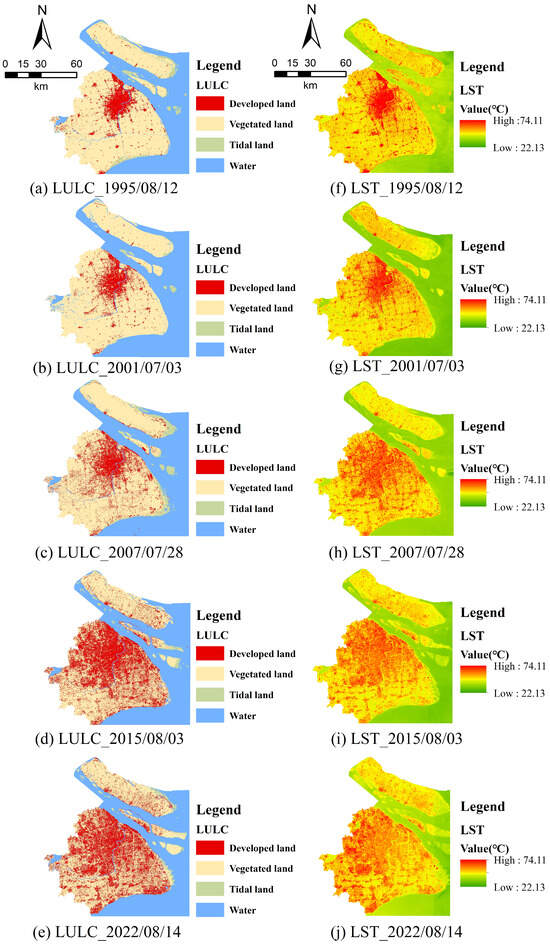 Overall patterns of annual LULC and LSTs in the study area. Note: (a–e) showing LULC maps from 1995 to 2022; (f–j) showing annual daytime LST maps of from 1995 to 2022.