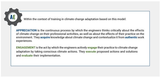 Drawing from thematic analysis of the interviews, four pedagogical pillars emerged as essential for climate adaptation training in civil engineering: appreciation (climate awareness), project-based learning, design thinking, and reflective practice. These pedagogical pillars—reinforced by the broader educational literature, particularly experiential learning theory [,], and validated by stakeholder insights—offer new contributions to current debates in engineering education reform [,]. Together, they form the foundation for the development of a practice-oriented framework titled the Model for Climate Change Adaptation through Appreciation and Engagement (AAEE model). Figure 1 illustrates the conceptual foundation of the model, showing how Appreciation (understanding climate impacts) in the color blue, and Engagement (active problem-solving) in the color green, work in an iterative cycle to reinforce adaptive capacity among engineers.