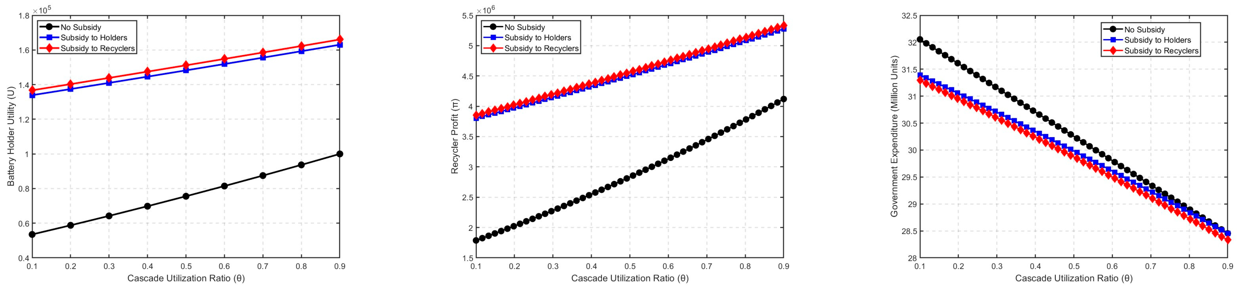This section aims to verify and conduct sensitivity analysis on the propositions and equilibrium results derived from the theoretical model through numerical simulation. According to Zhang’s research, the price elasticity coefficient is estimated to be between 0.8 and 1.2. This study adopts the median value and derives it based on a linear demand function. The environmental treatment cost per ton of waste batteries ranges from 1500 to 1600 RMB. The collection and transportation costs, including labor, storage, and logistics, average between 90 and 100 RMB per ton. The environmental treatment cost per ton of waste batteries is 1500–1600 RMB. China has an estimated 350 million electric bicycles in use, with an annual scrappage rate of about 7.5% and an average battery weight of 7 kg per vehicle; he cascade utilization rate is set within a range of [0.1, 0.9], covering scenarios from technologically immature to highly mature, ensuring the universal significance of the analysis results. A computational program fully corresponding to the theoretical model was built using MATLAB R2023B. By inputting parameters under different scenarios (no subsidy, subsidizing holders, subsidizing recyclers), the program can calculate equilibrium outcomes such as the optimal recycling price, recycling volume, and utility of each agent.