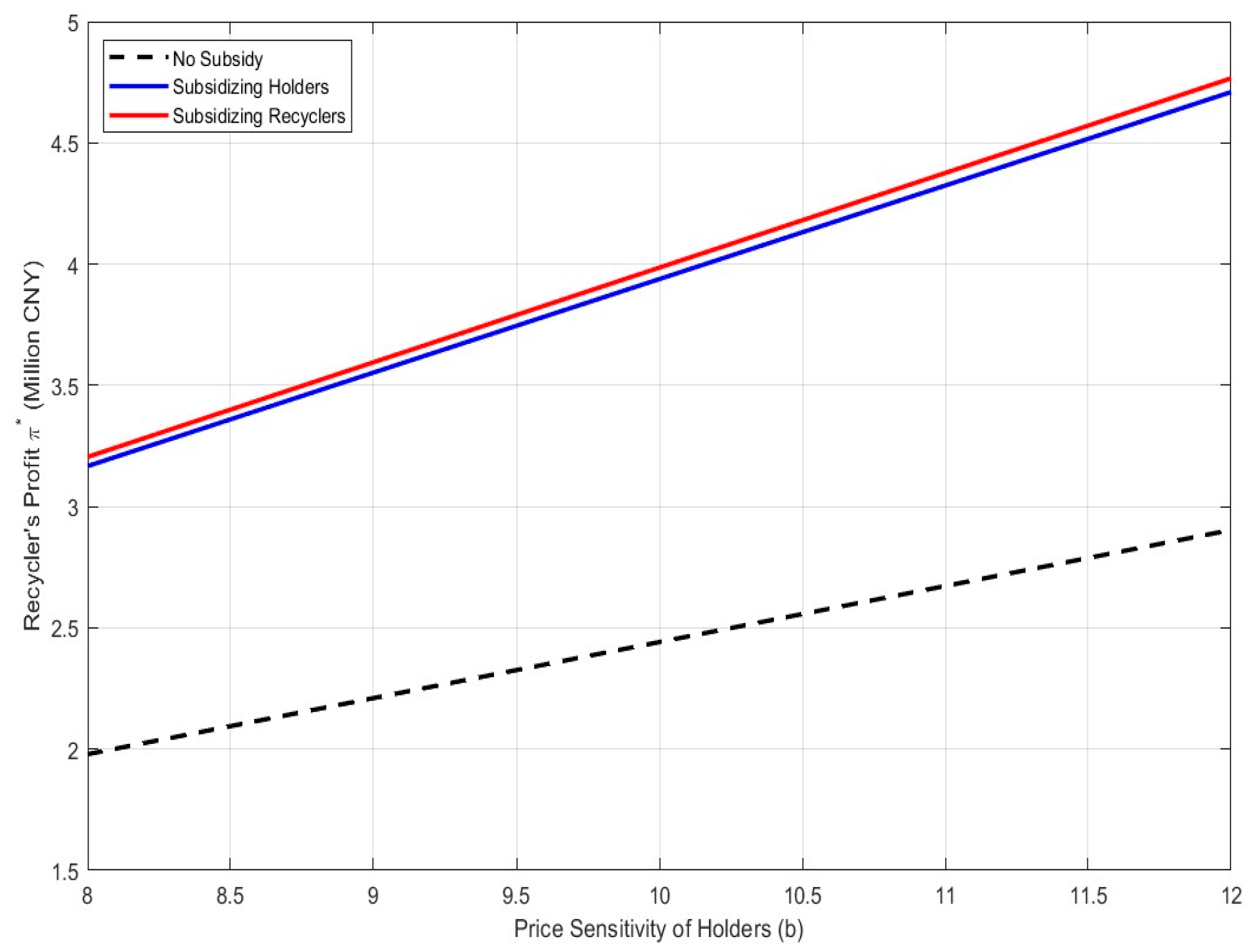 To ensure the reliability and generalizability of the research findings, this paper conducted a rigorous robustness analysis, focusing on the impact of changes in the key parameter—the price sensitivity of battery holders—on the model’s core output variables. This analysis systematically varied the values of parameter b and observed the response of recycler profit under three subsidy scenarios to verify the robustness of the main conclusions. The analysis is based on the game theory model established in the paper, with parameter values drawn from the literature and empirical data. The price sensitivity b was set to vary within the interval [