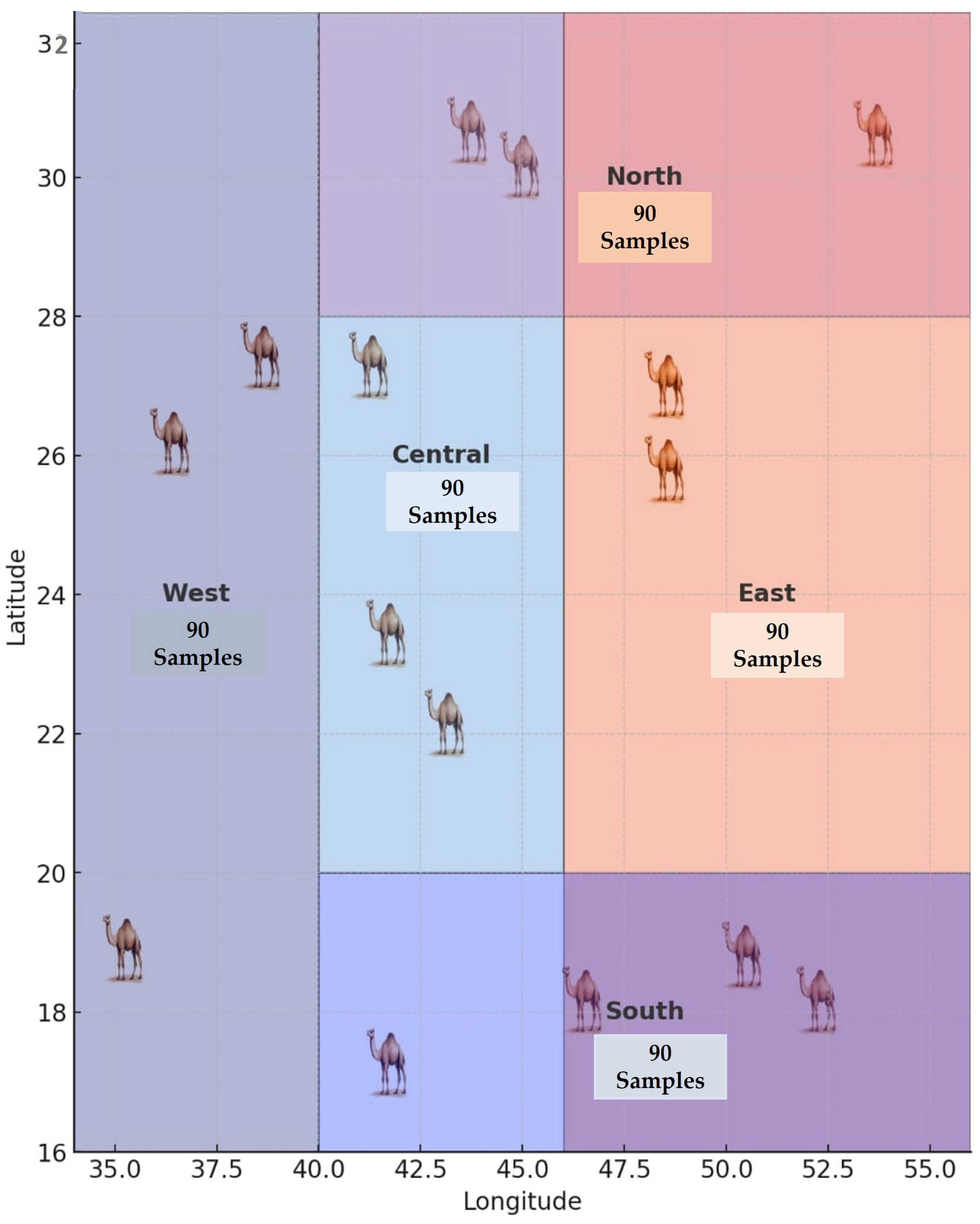 - Abdelrahman, M.M.; Alhidary, I.A.; Alobre, M.M.; Matar, A.M.; Alharthi, A.S.; Faye, B.; Aljumaah, R.S. Regional and seasonal variability of mineral patterns in some organs of slaughtered one-humped camels [Camelus dromedarius] from saudi arabia. Animals 2022, 12, 3343. [Google Scholar] [CrossRef] [PubMed]
