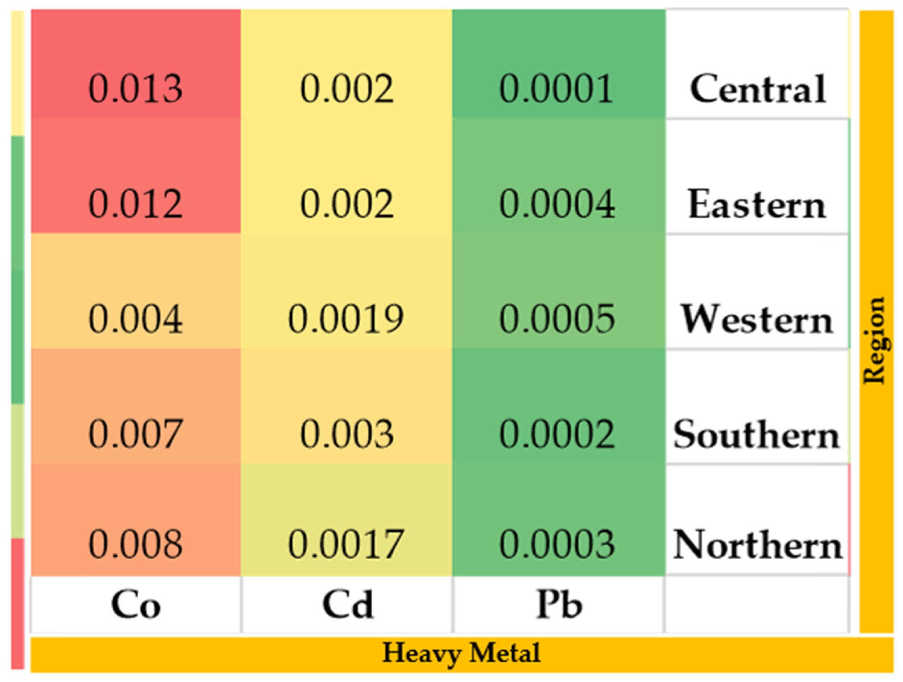 | Heavy Metals | Regions | SEM | p-Value | ||||
