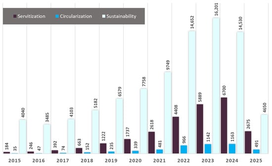 The dynamics of scientific publications in the fields of digital servitization in industry, circularization and sustainability (source: https://www.lens.org/ (accessed on 10 July 2025)).