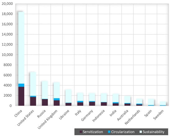 Regarding author geography (Figure 3), it can be noted that China is the leader in the number of publications across all search domains. This reflects a growing interest in linking digital servitization with sustainability in emerging markets. The United States ranks second, with an output more than two times lower than the leader. It is noteworthy that despite a significant number of publications with the keyword “sustainability” from researchers in Russia, Ukraine, and Indonesia, these countries are not represented in publications on the circular economy. Simultaneously, the Top 10 countries in this thematic area include the Netherlands, Spain, and Sweden, which are not leaders in other research directions.
