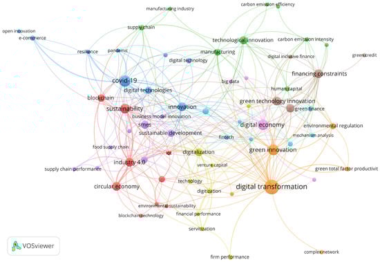 The conducted analysis of keyword co-occurrence in the studied samples (Figure 4, Figure 5 and Figure 6) has enabled the identification of main thematic research directions, as well as the terms used to characterize the subject domain. As depicted in Figure 4, the key structural elements of the network map are Digital Transformation, Innovation, Sustainability, Technological Innovation, Green Innovation, Circular Economy, and Industry 4.0, as evidenced by their prominent node size and high degree of connectivity.