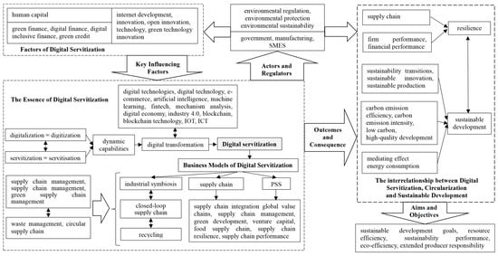 Digital servitization represents a relatively nascent field of scientific inquiry that has increasingly been considered through the lenses of circularization and sustainable development in recent years [5,6,7]. Although sporadic publications on integrating digital solutions into the business models of industrial enterprises have existed since the late 20th century, significant academic interest in this topic—specifically, in exploring the role, place, and significance of digital servitization for the sustainable development of economic systems—has only surged in the last decade. As noted by Peña and López, this surge constitutes a strategic response to intensifying global competition and technological progress [8]. Consequently, the ontology of this research domain remains in its formative stages. The terminological constructs of digital servitization are continuously expanding and being refined alongside the evolution of its core constituent trends: “digitalization,” “servitization,” “circularization,” and “sustainable development”. However, as Burton et al. highlight, the lack of consensus regarding the terminology used in studying digital servitization hinders the understanding of the factors that shape the barriers to and opportunities for implementing digital servitization business models, as well as its role in achieving the objectives of sustainable economic development [9]. Moreover, the aforementioned trends are often examined as isolated thematic domains, which does not align with the realities of the modern economy or the logic of industrial development. This approach, however, is limited in its ability to adequately address the systemic embeddedness of digital servitization within the overarching scholarly discourse on industrial sustainable development, representing a significant gap in the current research landscape.