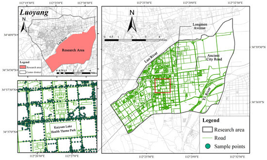 The study area selected for this research is the Luolong District in the central urban area of Luoyang City. Located south of the Luo River, this district serves as the core development zone for Luoyang’s current urban expansion. Compared to the traditional old city area, Luolong District has developed distinct built environment characteristics during rapid urbanization, featuring high-density residential zones, extensive road networks, and diversified functional zoning. Simultaneously, the area boasts a relatively abundant supply of parks and open green spaces. However, green spaces are unevenly distributed across different streets and sub-districts, revealing a pronounced pattern of green space differentiation (Figure 1). This coexistence of built environment and ecological foundations provides an excellent research foundation for exploring GVI spatial differentiation and its influencing factors.