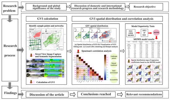 Existing research indicates that GVI exhibits not only significant spatial variation but also results from the combined influence of multiple factors. High GVI levels contribute to enhanced urban ecosystem services [39,40], optimized urban patterns, and improved resident mental health [41]; while low GVI may pose ecological risks, health hazards, and social inequities. Therefore, elevating GVI levels is crucial for urban development. Furthermore, GVI levels are closely linked to various factors, such as population and economic status [42,43], building density and layout, road density, elevation environment [44], and vegetation types and quantities [12,45,46], and landscape patterns [5,47]. However, existing studies predominantly focus on single factors, with relatively insufficient exploration of multidimensional, systemic factor systems. Regarding research methodologies for spatial analysis of the GVI, in recent years, some scholars have attempted to incorporate spatial statistics and geographically weighted models into GVI studies to investigate spatial heterogeneity within its driving mechanisms. For instance, some scholars have utilized street-level imagery and multi-source data to apply Geographic Weighted Regression (GWR) models or machine learning-enhanced variants, examining how diverse factors influence GVI’s spatial heterogeneity [48]. Other studies employed Multiscale Geographically Weighted Regression (MGWR) models to further identify the operational scales of different variables, revealing significant variations in GVI’s driving mechanisms across urban districts [13]. Still other studies have analyzed the spatiotemporal variation in GVI using Geographically and Temporally Weighted Regression (GTWR) models at temporal scales [49]. While these investigations have enriched our understanding of the spatial distribution of GVI and its environmental coupling, most practical applications remain focused on macro-scales. Systematic exploration of GVI spatial variation at the street level and the multiscale driving mechanisms of different factors remains limited.