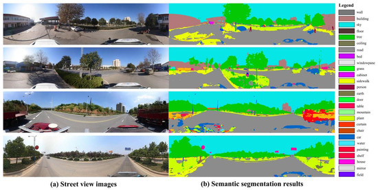 During semantic analysis, a deep convolutional neural network-based semantic segmentation method was employed to interpret the street scene images. Specifically, this study constructs a semantic segmentation model based on the Pyramid Scene Parsing Network (PSPNet) framework. It adopts a structure comprising a ResNet50-Dilated encoder and a Pyramid Pooling Module (PPM) decoder, pre-trained on the ADE20K dataset (150 classes). This model achieves pixel-level classification for typical urban landscape elements such as buildings, roads, vegetation, and sky. The model comprises three main components: (1) a ResNet50-Dilated backbone network for deep feature extraction; (2) a Pyramid Pooling Module (PPM) to aggregate global and local contextual information across multiple scales; (3) a summarization classification layer to generate pixel-level predictions for final semantic segmentation. Additionally, to ensure segmentation reliability, 100 images were randomly selected for manual annotation. Model outputs were compared against human annotations, and pixel accuracy for the green vegetation category was calculated. Results demonstrate the model’s capability to achieve high-precision segmentation in street-view imagery, providing reliable data support for subsequent GVI quantification. This approach accurately identifies and extracts green elements from complex street scenes, providing data support for subsequent quantitative analysis [60]. The segmentation results are shown in Figure 3.