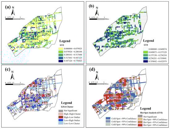 Spatial Distribution Patterns of GVI. (a) Spatial Distribution of GVI (b) GVI Fishnet Visualization (c) Local LISA Clustering (d) Hotspot Analysis.