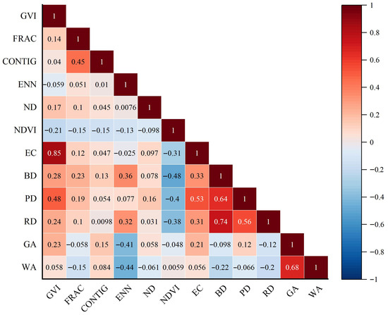 To explore the relationship between various influencing factors and GVI, this study first employed Spearman’s correlation coefficient for exploratory analysis of the global linear relationships among variables (Figure 5). This identified potential multicollinearity issues and provided a reference for subsequent modeling. Results showed that most correlation coefficients had absolute values below 0.5, indicating no severe multicollinearity among variables.