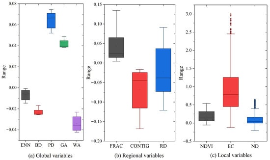 MGWR Coefficient Box Plots. (a) Global Variables; (b) Regional Variables; (c) Local Variables.