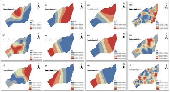 Spatial Distribution Map of Regression Coefficients Based on the MGWR Model. (a) FRAC; (b) CONTIG; (c) ENN; (d) EC; (e) NDVI; (f) BD; (g) PD; (h) ND; (i) RD; (j) WA; (k) GA; (l) Intercept.