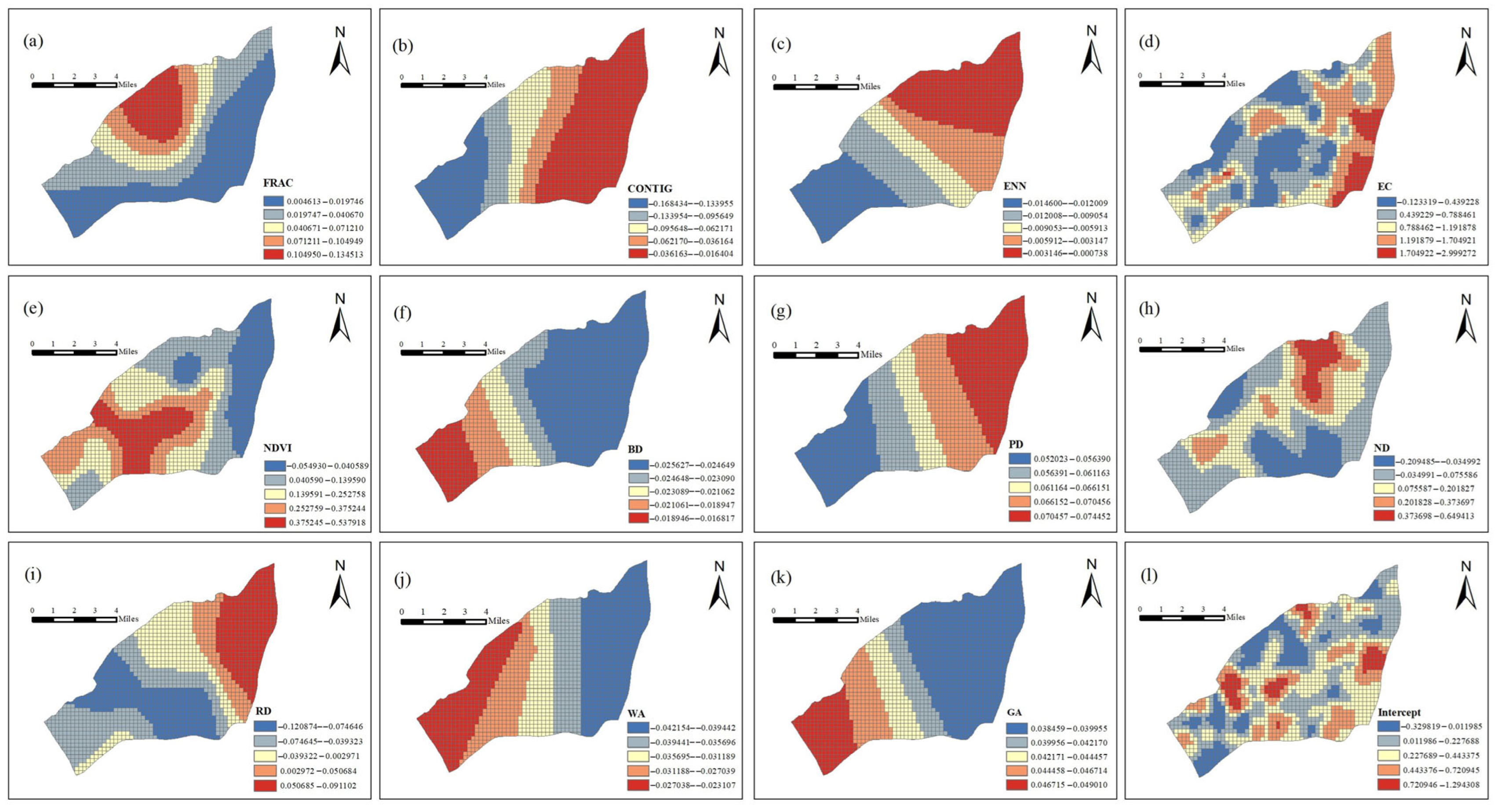 - The MGWR model reveals significant spatial differences in the influence scales of various factors. Among them, ENN, BD, PD, GA, and WA exert global effects on GVI, while factors such as FRAC, CONTIG, RD, NDVI, ND, and EC demonstrate regional dependence.