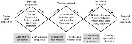 - Blomsma, F.; Pieroni, M.; Kravchenko, M.; Pigosso, D.C.; Hildenbrand, J.; Kristinsdottir, A.R.; Kristoffersen, E.; Shahbazi, S.; Nielsen, K.D.; Jönbrink, A.-K. Developing a Circular Strategies Framework for Manufacturing Companies to Support Circular Economy-Oriented Innovation. J. Clean. Prod. 2019, 241, 118271. [Google Scholar] [CrossRef]
